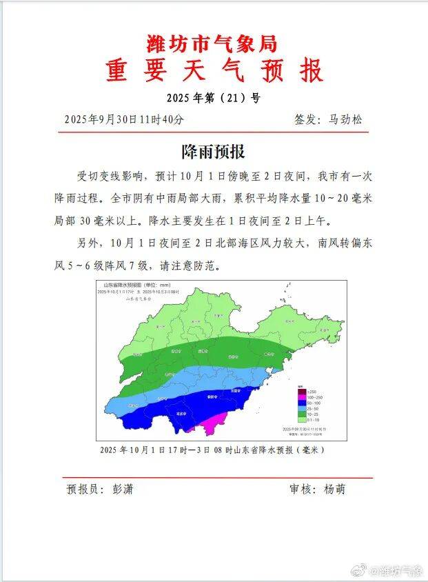 受切变线影响,预计10月1日傍晚至2日夜间,我市有一次降雨过程。全市阴有中雨局部大雨,累积平均降水量10-20毫米局部 30 毫米以上。降水主要发生在1日夜间至2日上午。