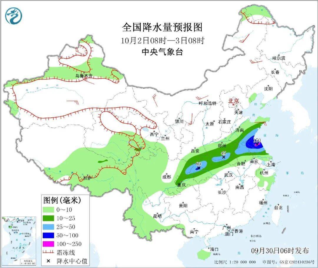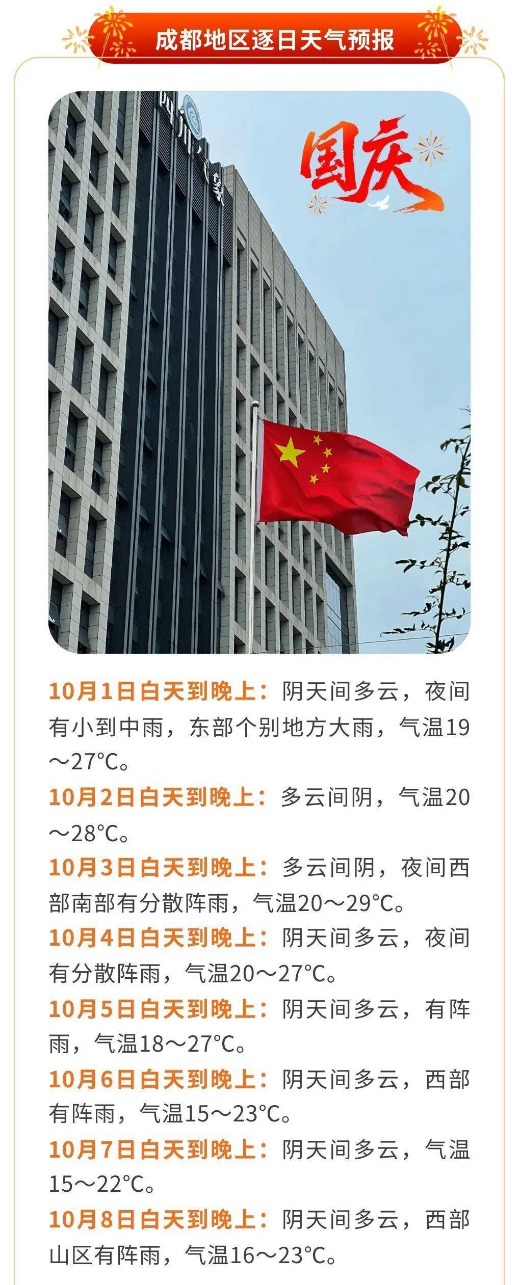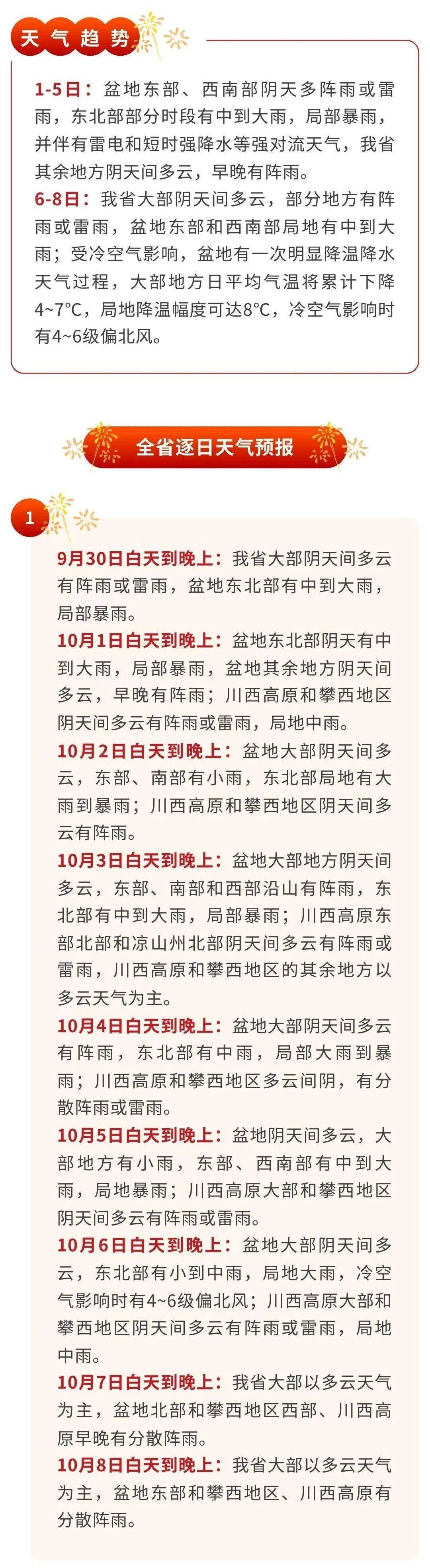 据中央气象台,10月1日至5日,华西至黄淮一带多降雨天气,主要影响地区包括四川、陕西、重庆、湖北、河南、山东、苏皖北部等地,上述地区累计降雨量40至80毫米,部分地区120至180毫米,四川东北部、陕西南部、重庆北部局地可超300毫米。其中,最强降雨时段为1至2日。
