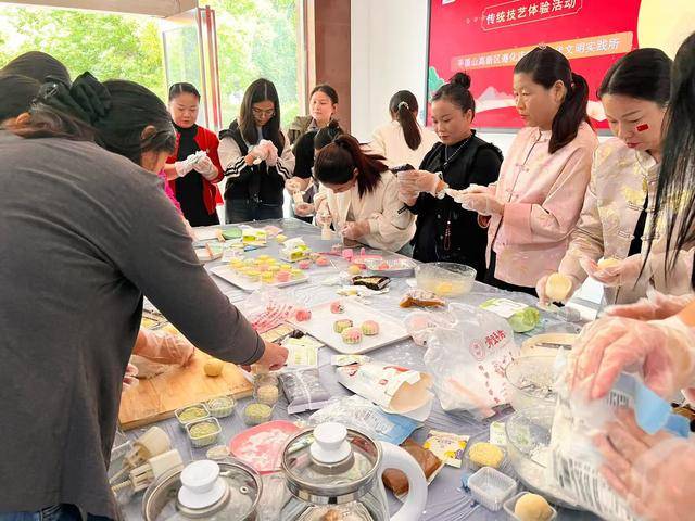 在冰皮月饼制作区,志愿者们早早便备好了预拌粉、莲蓉、豆沙等丰富食材,及印有“中秋”“福”“团圆”等字样的各式模具。在志愿者的指导下,大家认真学习揉制冰皮、包馅、压模的步骤,不一会儿,一个个造型美观、花纹清晰的冰皮月饼便摆满了托盘。