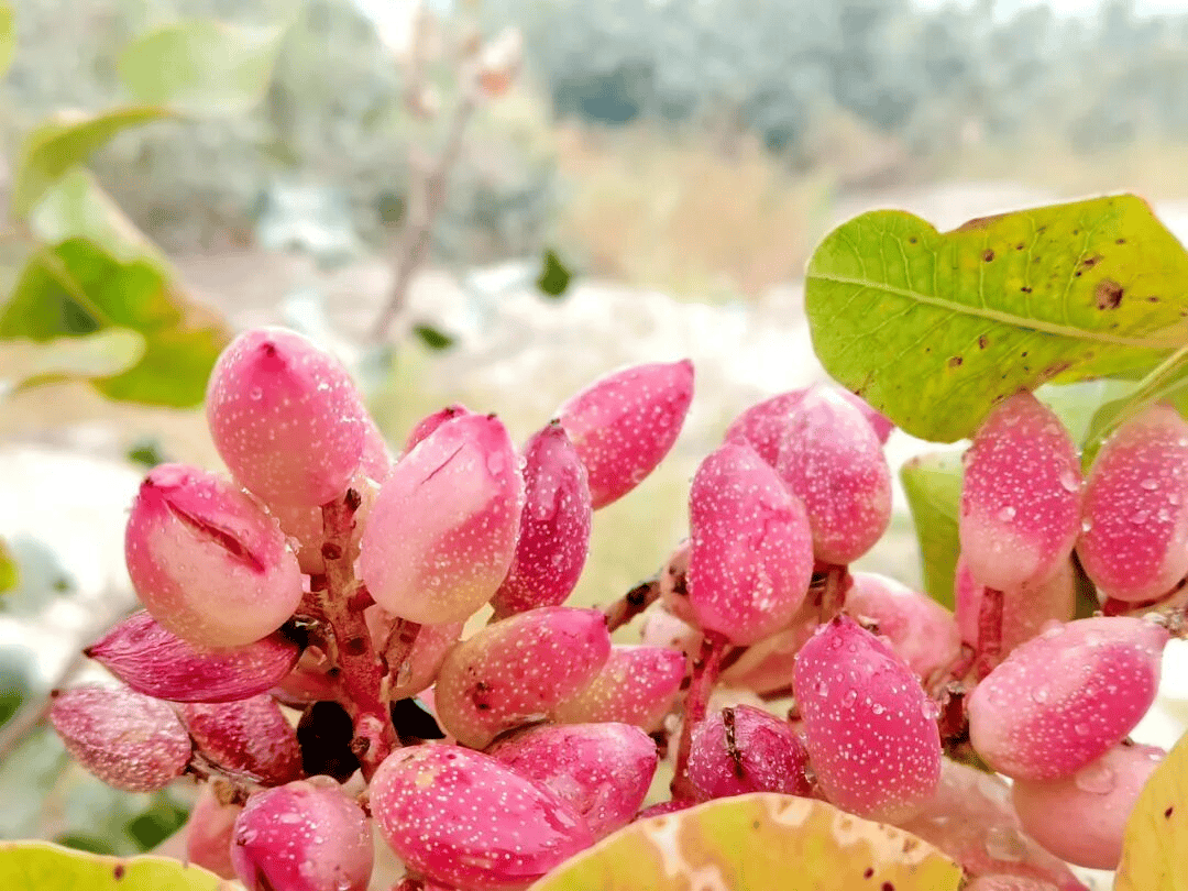 他说:“我们这个开心果基地有180亩地,5000棵开心果树,现在已经开始熟了,价格挺好的,卖到伽师县、于田县,看今年的价格,我们收入还不错。”