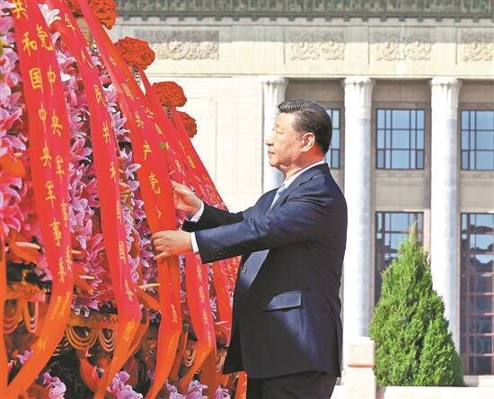 9月30日上午,党和国家领导人习近平、李强、赵乐际、王沪宁、蔡奇、丁薛祥、李希、韩正等来到北京天安门广场,出席烈士纪念日向人民英雄敬献花篮仪式。这是习近平整理花篮上的缎带 新华社发 |