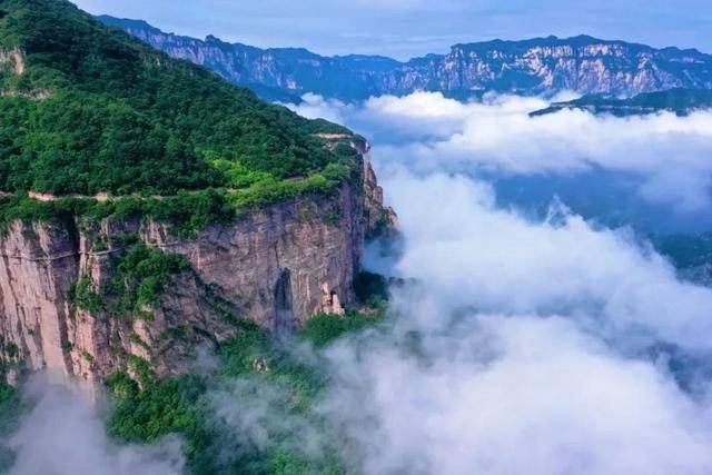 云峰画廊由7个各具特色的观景台构筑而成,可360°观览太行胜景,红岩绝壁与云海交融,徒步其间仿佛置身云端秘境。