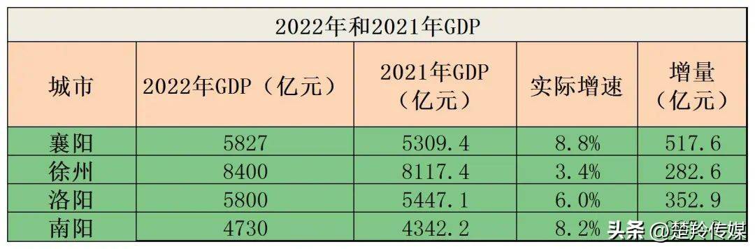 | 南阳 | 65 | 2202 | | 襄阳 | 69 | 2132 | 2012年 | 城市 | 全国排名 | GDP(亿元) | |------|---------|-------------| | 洛阳 | 47 | 3001 | | 襄阳 | 67 | 2502 |