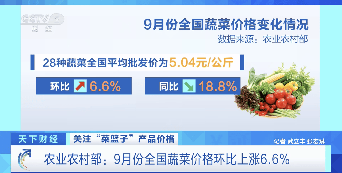 (央视财经《天下财经》)今天(10月1日),记者从农业农村部了解到,9月份全国菜篮子价格指数整体上行,其中,蔬菜价格环比上涨,上涨幅度较上月有所收窄。