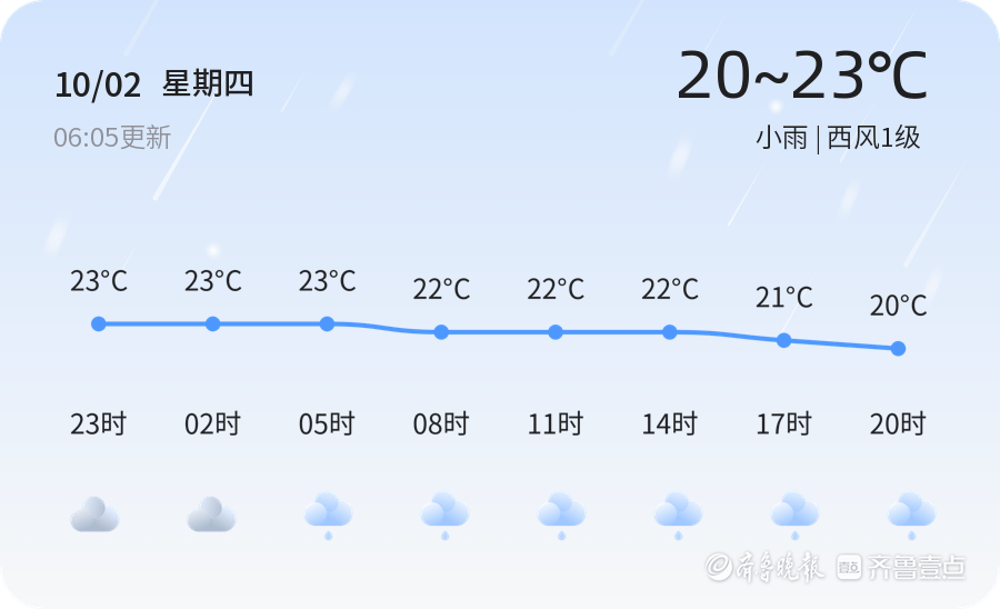 今天是10月2日,星期四,农历八月十一。威海市今日天气以小雨为主,气温在20℃至23℃之间,风力较小,西风1级。空气湿度为71%,PM2.5指数为35,空气质量良好。各区天气情况基本一致,均为小雨,风力平稳,市民出行需注意携带雨具。
