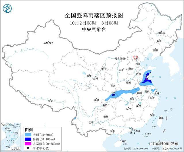 中央气象台10月2日06时继续发布暴雨蓝色预警: