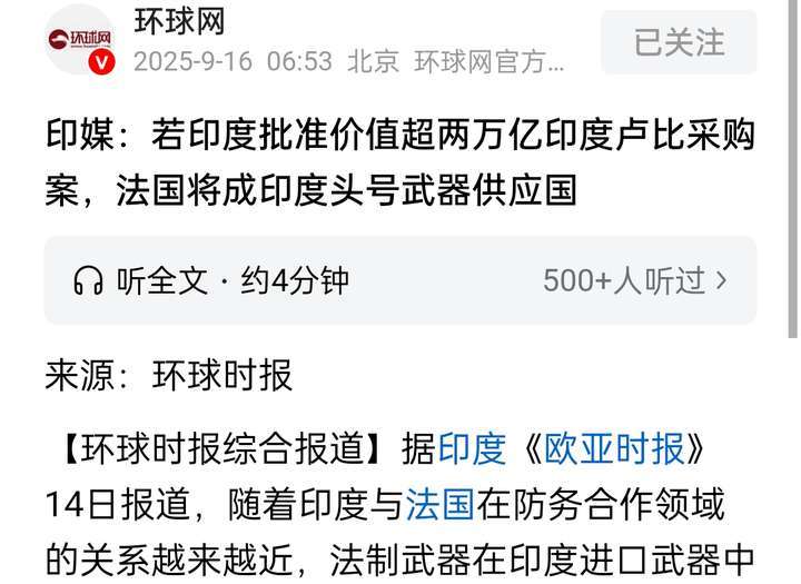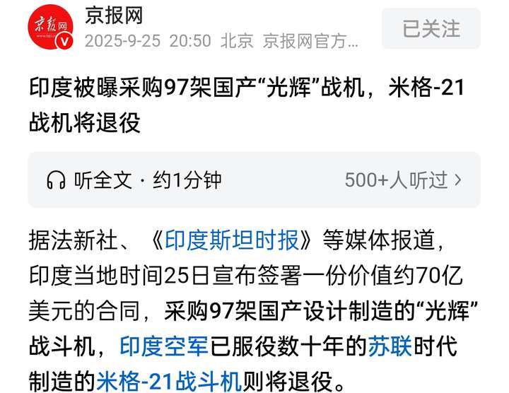 消息来源:《北京日报》9月30日报到《印度被曝采购97架国产“光辉”战机,米格-21战机将退役》