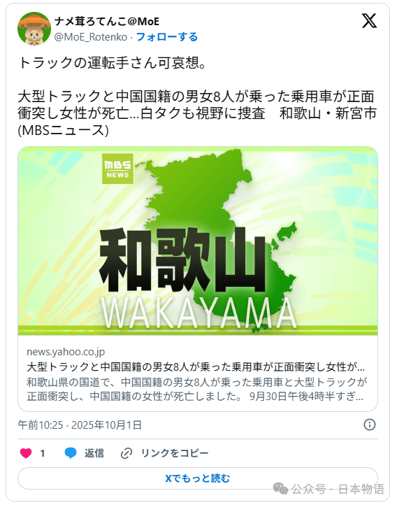 9月30日下午,日本和歌山县新宫市熊野川町的国道168号发生了一起严重的交通事故。一辆搭载中国游客的普通乘用车,与一辆大型卡车迎头相撞,结果造成一死一重伤六轻伤。