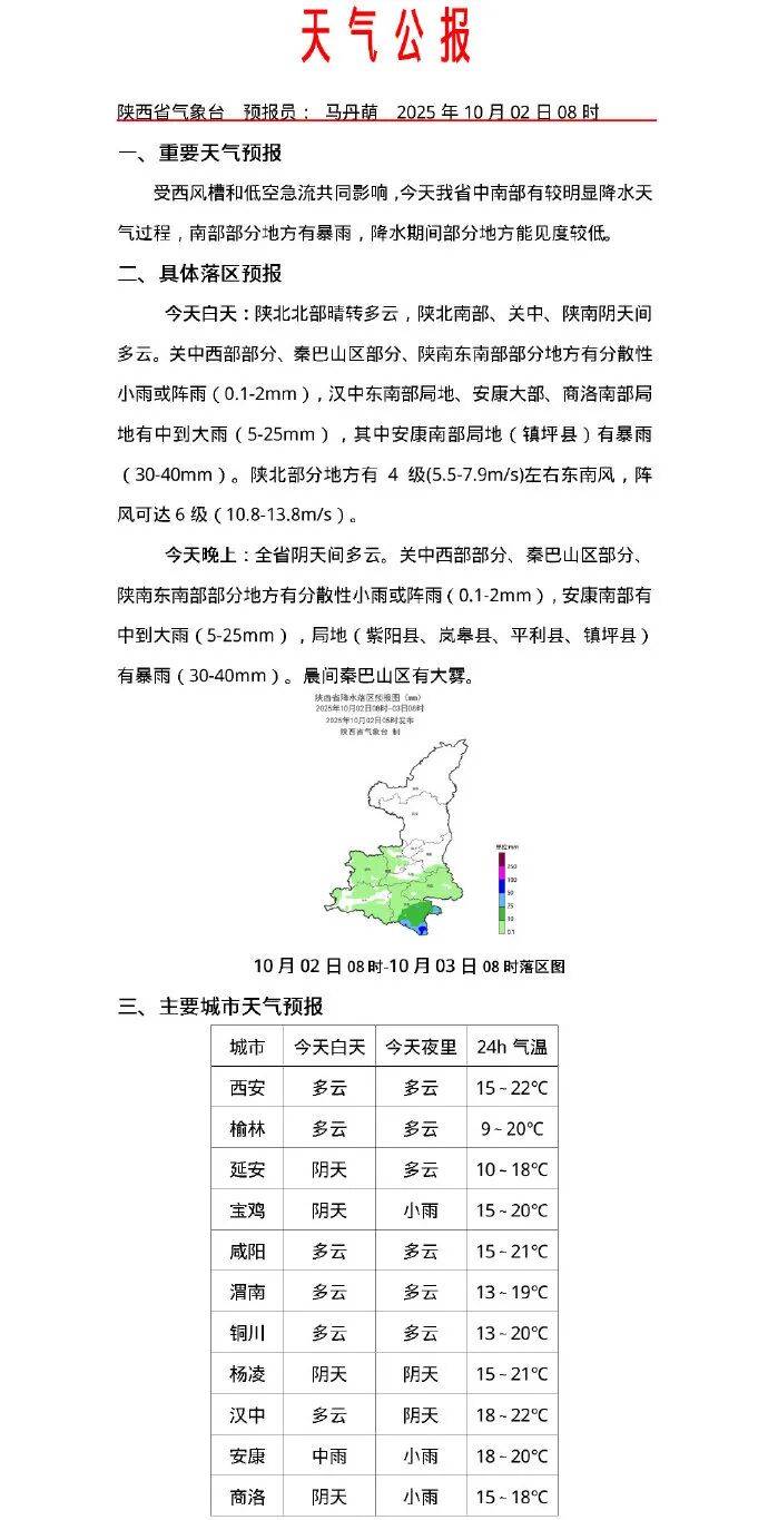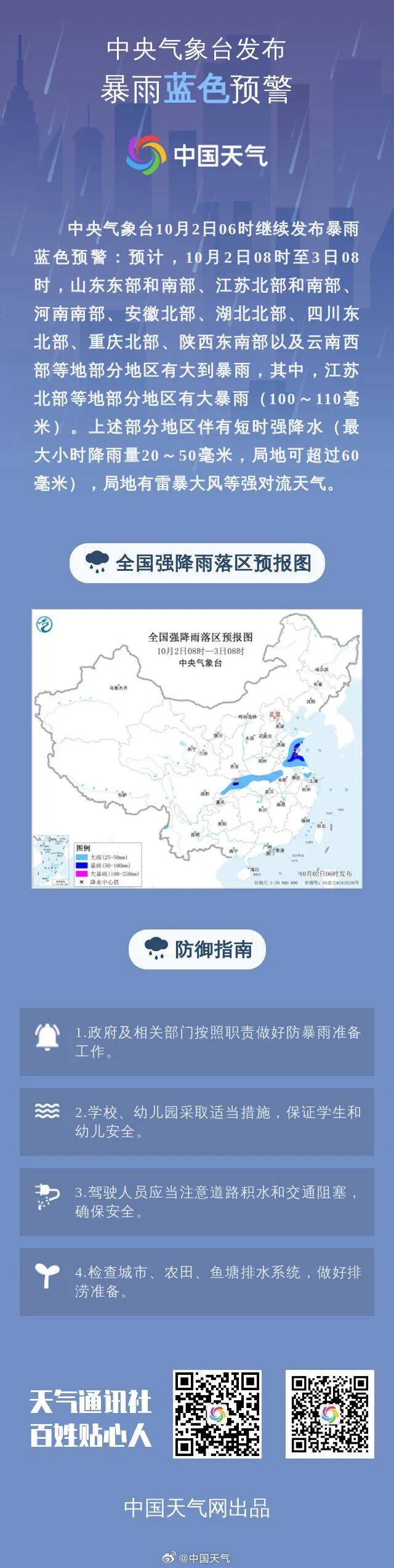 预计,10月2日8时至3日8时,山东东部和南部、江苏北部和南部、河南南部、安徽北部、湖北北部、四川东北部、重庆北部、陕西东南部以及云南西部等地部分地区有大到暴雨。