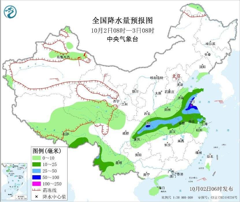 央视网消息:据中央气象台消息,昨日(10月1日),较强降雨主要出现在华西至黄淮一带,其中,四川东北部、陕西南部、重庆北部、湖北西部、河南东部、山东西南部、安徽北部等地出现暴雨,局地大暴雨。预计今天,雨带东段将东移南压,四川东北部、重庆北部、陕西东南部、湖北北部、河南南部、山东东部和南部、安徽北部、江苏北部等地将有大到暴雨,其中,江苏北部局地大暴雨(100~110毫米)。上述部分地区并伴有短时强降水、雷暴大风等强对流天气。