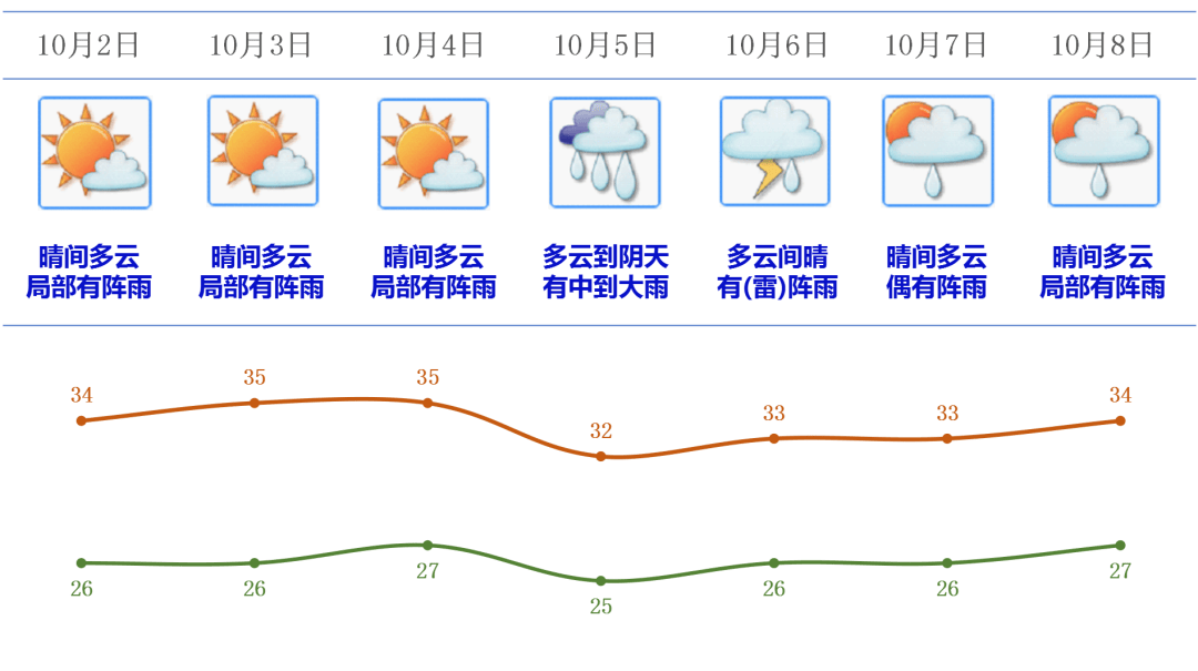 6-8日,广东省大部多云,部分市县有(雷)阵雨。