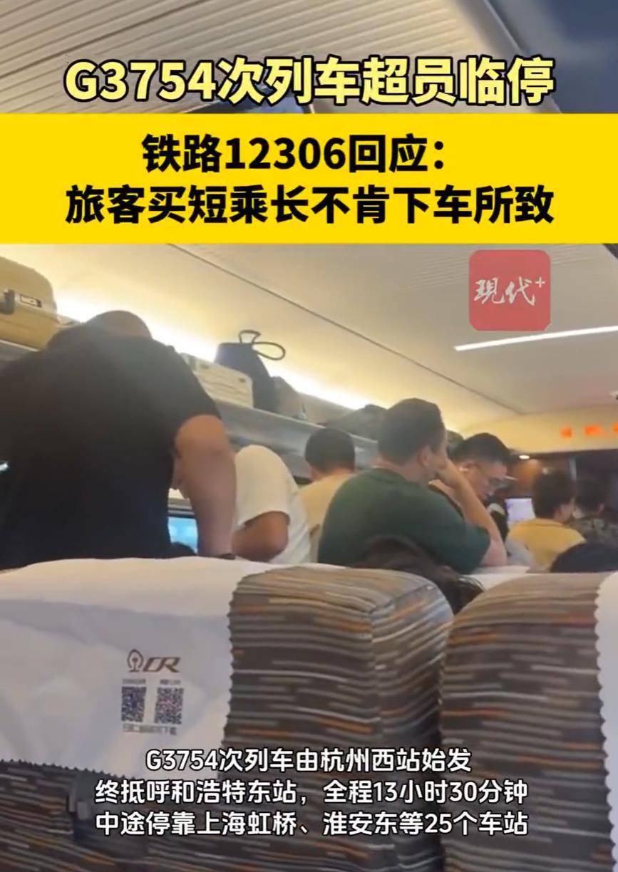 据乘坐该列车的多名乘客表示,G3754次列车当天在张家港站临停40分钟左右,短途的不给补票,列车员清了一部分人下车,同时把人分散到车厢各个位置,才解除预警,后续途中又有两次同样的超员报警、列车临停的情况,最终比计划时间晚点了1个多小时。