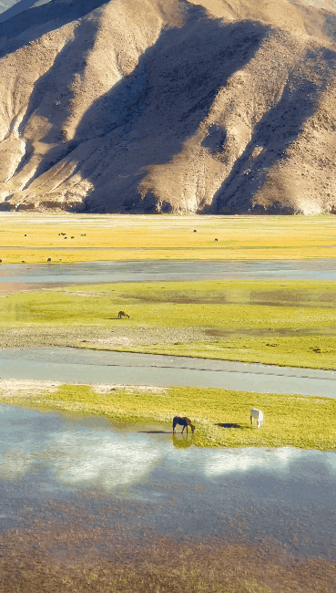 帕米尔高原上,牛羊就在粼粼波光中饮水,远方是雄壮的山脉。