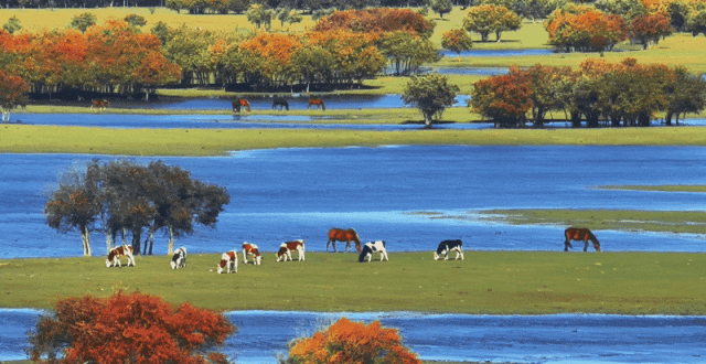 额尔古纳河畔,秋是一抹被揉碎的红,在幽蓝的河水和碧绿的草地之上,牛羊就在其间“踏秋”,给这幅斑斓画卷增添了些许生机。