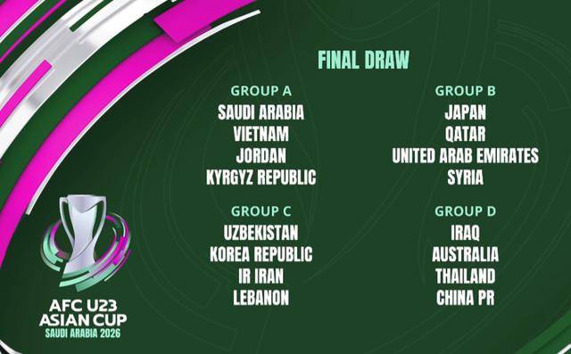 10月2日下午,2026年沙特U23亚洲杯正赛分组抽签揭晓,中国队与伊拉克、澳大利亚和泰国同组。这是中国队历史上第6次闯入U23亚洲杯正赛。此前五次征程,中国队从未小组出线,总战绩仅为2胜13负。2013年,中国队3战3负小组出局;2016年,3战3负小组出局;2018年,1胜2负小组出局;2020年,3战3负小组出局;2022年,退出预选赛;2024年,1胜2负小组出局。本届U23亚洲杯决赛阶段的比赛将于2026年1月7日至25日在沙特举行,希望中国队能有所突破。