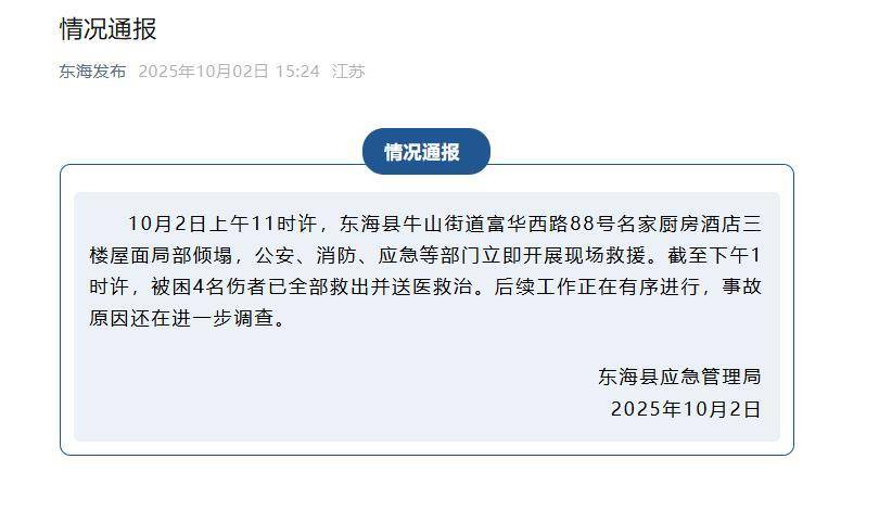 据江苏省连云港市东海县官方通报,10月2日上午11时许,东海县牛山街道富华西路88号名家厨房酒店三楼屋面局部倾塌,公安、消防、应急等部门立即开展现场救援。截至下午1时许,被困4名伤者已全部救出并送医救治。后续工作正在有序进行,事故原因还在进一步调查。