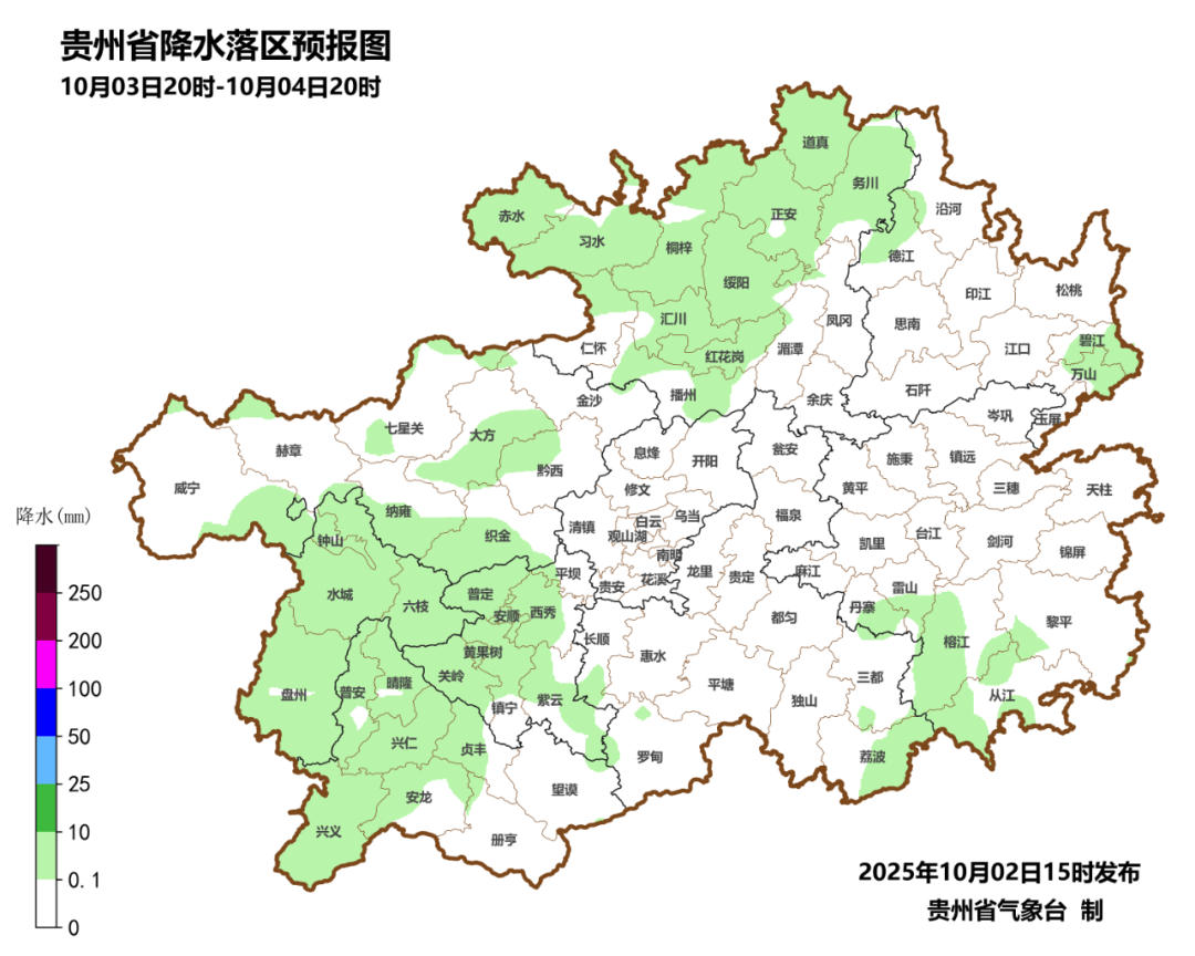 10月1日08时至2日08时,大雨出现在黔西南州的兴义1县域内的5个观测站(乡镇最大为兴义市仓更镇仓更纳达水库30.3毫米),中雨有24个观测站,小雨有1805个观测站。有1个县(黔西南州的兴义)5站次出现短时强降水,小时雨强最大为兴义市仓更镇仓更纳达水库29.4 毫米(2025-10-01 18:00)。