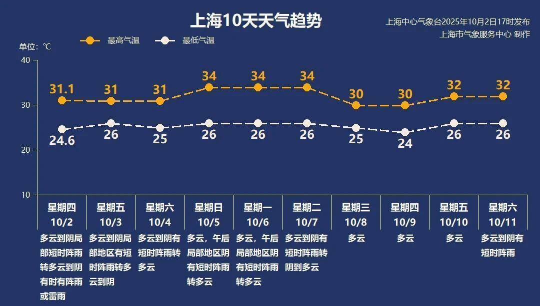 随着副热带高压再度增强,南方高温范围将再度扩张,上海5-7日最高气温可达34℃,天气炎热,市民要适当防暑。午后或有短时阵雨,出行备把晴雨伞,遮阳挡雨两不误。不过在偏东气流的控制下,天空颜值在线,出游拍照更加分。假期最后两天,随着北方弱冷空气扩散南下,最高气温又将回落至30℃附近。