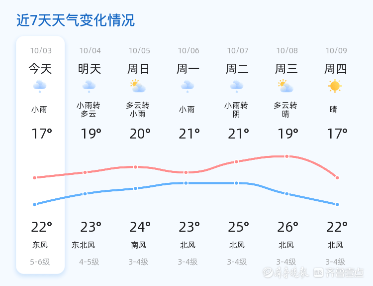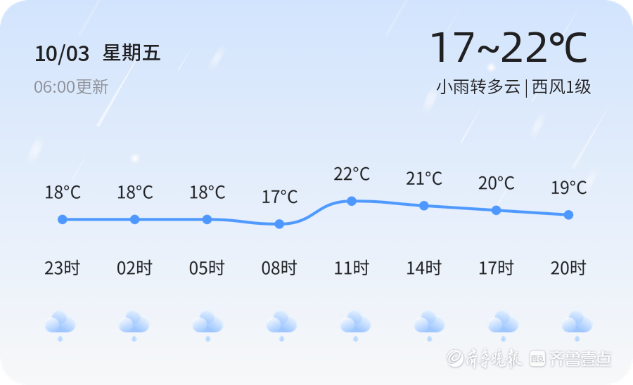 今天是10月3日,星期五,农历八月十二。青岛市今日天气为小雨转多云,气温在17℃至22℃之间,西风1级,空气湿度较高,达95%。全市各区均出现小雨天气,部分地区伴有东风5-6级风力,市民出行需注意防雨和防风。目前PM2.5指数为35,空气质量良好。