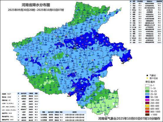 省气象台监测显示,9月30日20时至10月3日7时,全省大部出现大到暴雨,郑州、商丘、南阳等地局部大暴雨。全省平均降水量33.9毫米,地市平均降水量位列前三的分别为:开封53.4毫米、商丘52.8毫米、郑州49.5毫米。降水量位列前三的分别为:桐柏县佛学院116.5毫米、新郑市好想你115.4毫米、永城市高庄109.6毫米。整点最大小时降水量为桐柏县佛学院55.3毫米(10月2日1时至2时)。