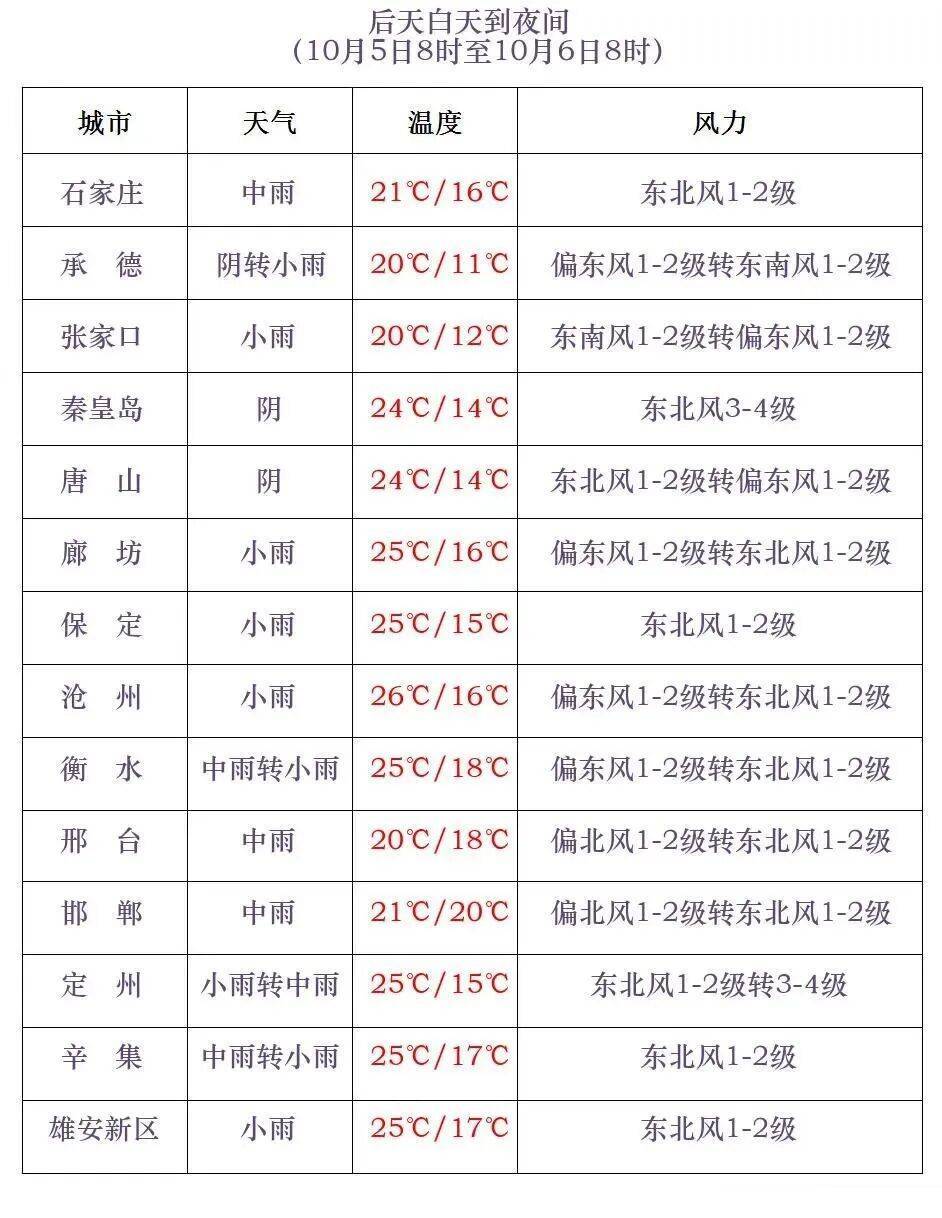 5日夜间到6日,全省阴,中南部地区有中雨到大雨,其他地区有小雨或零星小雨。渤海海域和沿海地区有东北风5到6级,阵风7到8级。