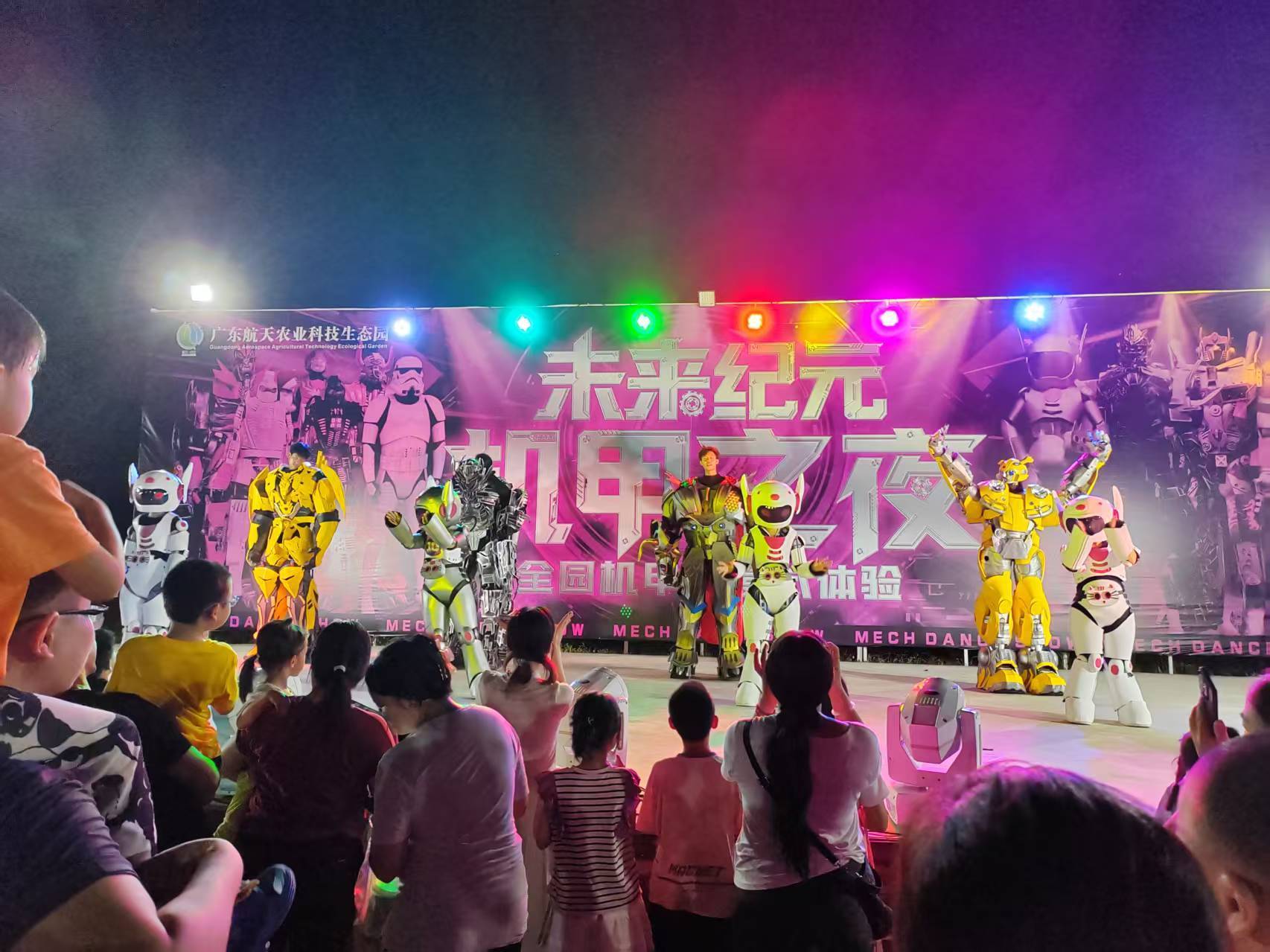 “考虑到双节游客的多样需求,我们设计了全天候活动安排。” 张卓瑞表示,白天有互动、有表演,夜晚则切换“赛博朋克模式”,以“机甲幻境舞蹈狂欢”为核心,打造多维光影盛宴。届时,农田、温室大棚将在灯光效果下化作霓虹交织的奇幻空间,热气球点亮仪式上可一睹火焰喷发的震撼瞬间,无人机编队将会在空中勾勒出航天与机甲的融合图案,而最受期待的“灯光花船”,则搭载 LED 灯带与激光投影,在水面缓缓巡游,游客可伴着音乐驻足观赏,感受“双节”的团圆氛围。