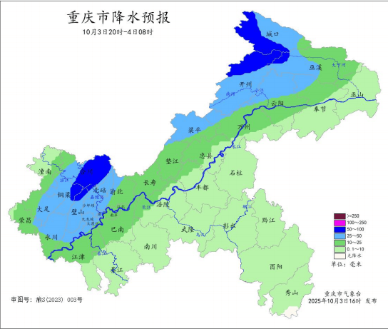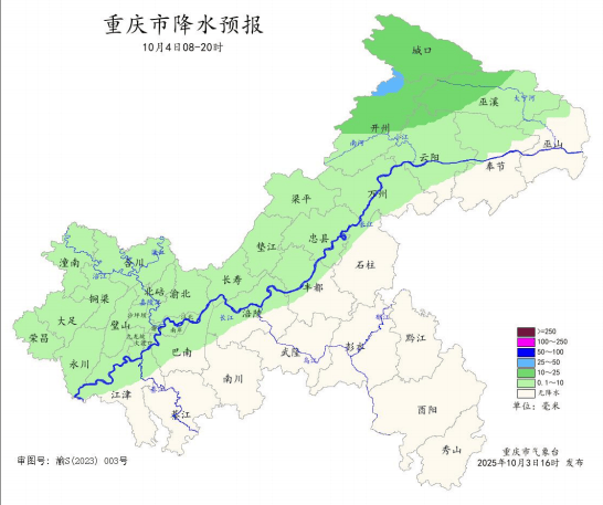 根据重庆市气象台预计,未来一周重庆市先雨后晴。10月3日夜间,长江沿线以北地区中到大雨(20~40毫米),局地暴雨(50~80毫米);10月4日,长江沿线以北地区阵雨;10月5—10日,各地多云到晴。