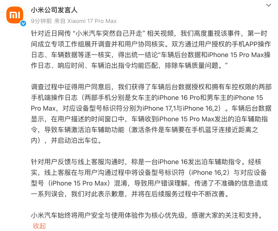针对近日网传 “小米汽车突然自己开走” 相关视频,我们高度重视该事件,第一时间成立专项工作组展开调查并和用户协同核实。双方通过用户授权的手机APP操作日志、车辆数据等逐一核实,得出统一结论“车辆后台数据和iPhone 15 Pro Max操作日志、响应时间、车辆泊出指令均能匹配, 排除车辆质量问题。”