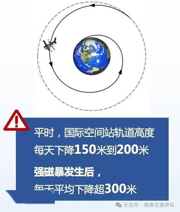 如果大气密度增加的话,会给空间站、卫星的大气拖曳力都带来增加,这会使轨道不断地衰变。平时空间站的轨道高度每天下降150~200米,如果碰上一次大的太阳爆发、地磁暴产生之后,每天就要下降超过300米。
