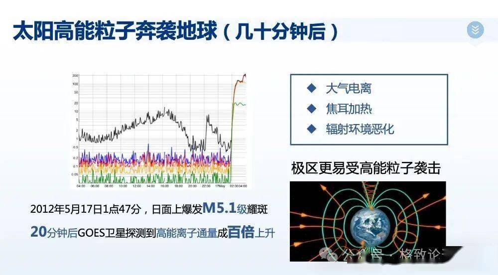 它会在太阳表面加速一些高能带电粒子,这些高能带电粒子从太阳传播到地球,大致是几十分钟的量级。它就像一个先遣部队,虽然速度比较快、能量比较高,但是规模比较小。