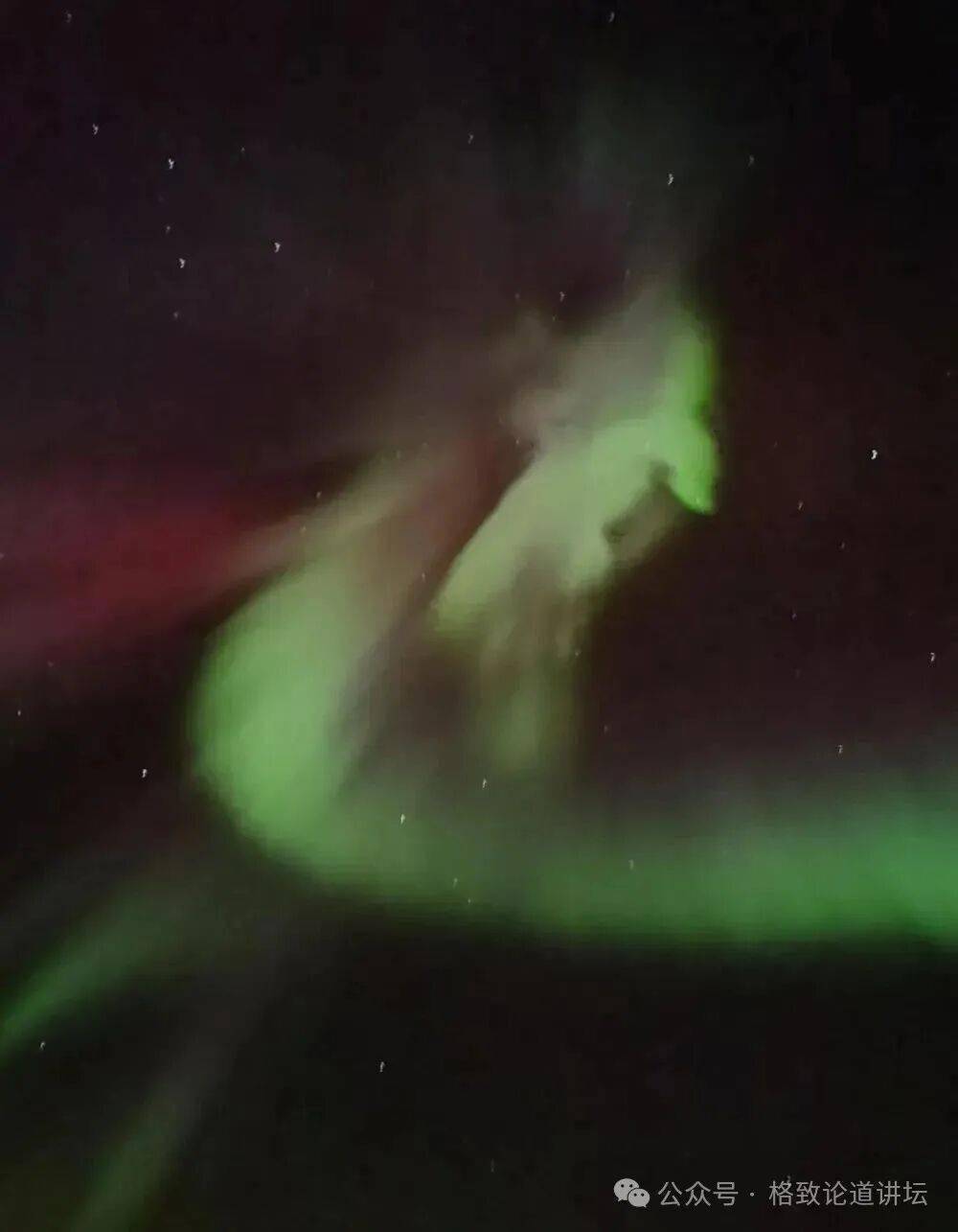 非常遗憾的是,当时我并不在北京,我在一个可以更理想地看到极光的地方——冰岛。下面这张照片是当时我用手机拍的,是在冰岛同一时间观看到的极光。你看这极光是不是像一条飞舞的中国龙?