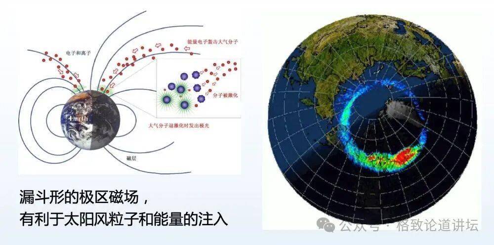 在地球上,只有在两极的地区,磁力线是从太空直接进入到大气,所以这些高能粒子沿着磁力线进入到大气层,轰击大气,就会产生美丽的极光的现象。