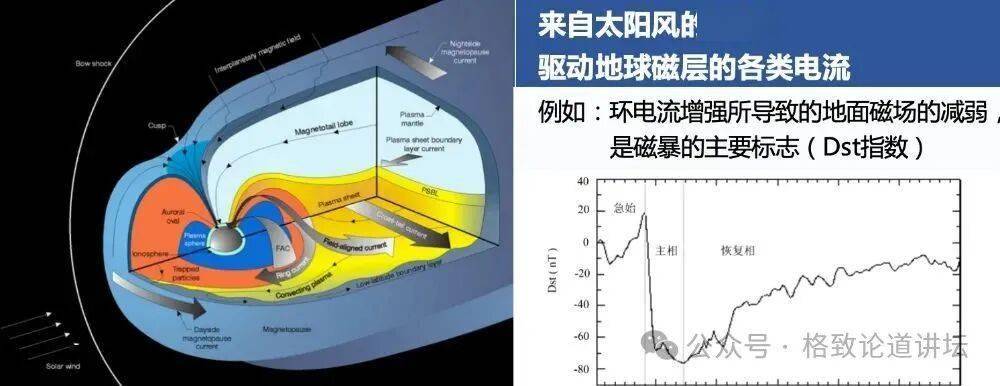 大家都知道,电流体系的变化也会引起整个地表磁场、空间磁场的变化,所以太阳活动会引起全球磁场的剧烈变化,这就是我们经常在媒体上所听说的“地磁暴”。所以太阳风暴引起地磁暴,就是这个物理变化过程。
