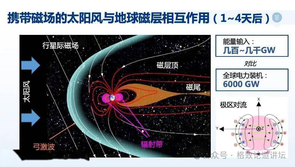 每一次能量的输入能够达到几百到几千GW。目前全球电力的装机大致也就是6000GW的量级,所以它一次输入到地球空间的能量是巨大的,而且它会影响地球空间整个磁场的体系,引起磁力线的变形、磁场的变形。