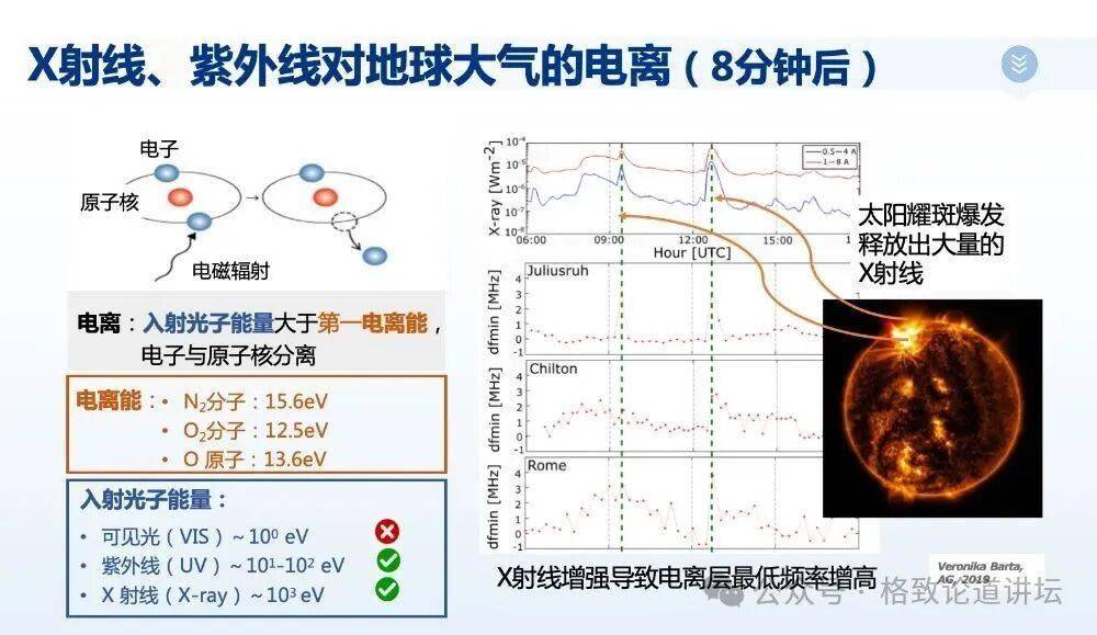 第一轮打击是X射线、紫外线光速传播8分钟之后到达地球,它能够使地球大气产生电离。在地球空间90公里到350公里的高度上面有一层电离层,X射线和紫外线是产生这个电离层的主要物理机制。