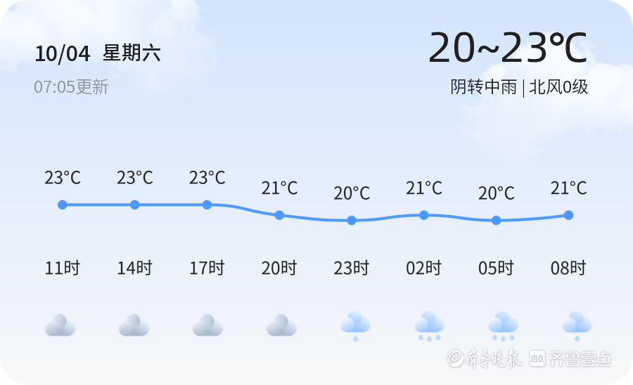 今天是10月4日,农历八月十三,星期六。枣庄市今日天气为阴转中雨,气温在20℃至23℃之间,北风0级,空气湿度高达97%,PM2.5指数为34,属于优级空气质量。目前温度为19.6℃,市民出行时建议携带雨具,注意路面湿滑,行车时请减速慢行,确保安全。