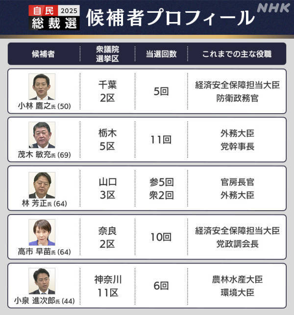 5名自民党总裁候选者的基本信息NHK