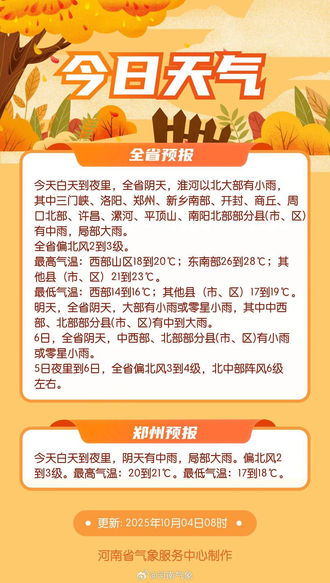 据河南气象消息,今天白天到夜里,全省阴天,淮河以北大部有小雨,其中三门峡、洛阳、郑州、新乡南部、开封、商丘、周口北部、许昌、漯河、平顶山、南阳北部部分(市、区)有中雨,局部大雨。