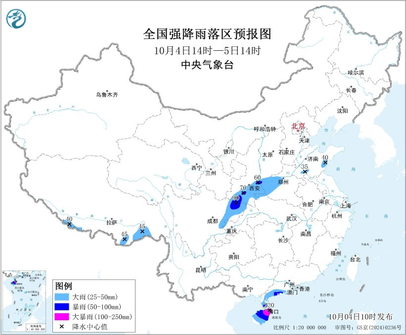 预计,10月4日14时至5日14时,海南岛中北部、广东西南部、西藏东南部以及四川盆地东部、陕西南部、河南西北部等地部分地区有大到暴雨,其中,海南岛东北部局地有大暴雨(100~220毫米);上述部分地区伴有短时强降水,最大小时降雨量20~40毫米,华南局地可超过80毫米。