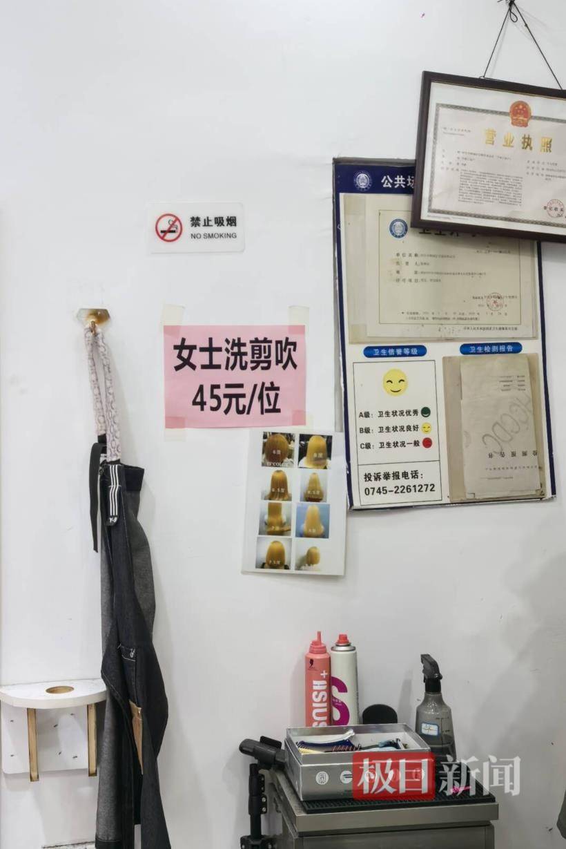 极目新闻记者注意到,店内墙上标注的理发价格为女士洗剪吹45元/位、男士洗剪吹30元/位,与去年媒体报道时的价格一致。