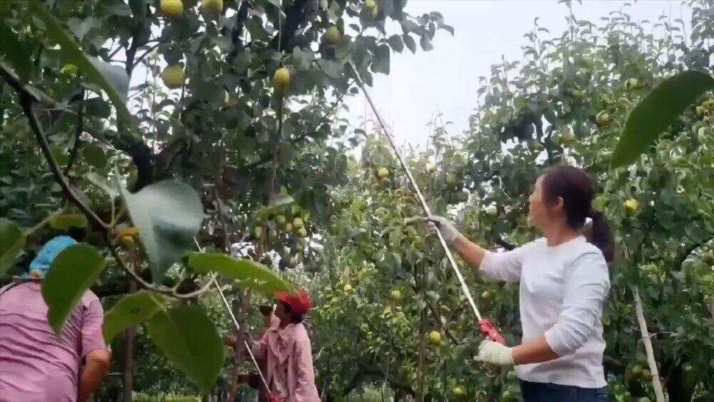 江苏省灌云县伊山镇七里松村种植的酥梨进入成熟期,种植户趁着晴好天气采摘酥梨,供应中秋、国庆节日市场。