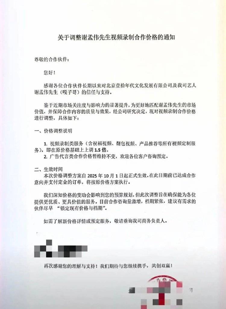 9月26日,有网友在网络平台发布了一则《关于调整谢孟伟先生视频录制合作价格的通知》,通知中称,鉴于近期市场关注度与影响力的显著提升,为更好地匹配谢孟伟先生的市场价值,并保障合作内容的质量与效果。经公司研究决定,现对视频录制合作价格进行调整,视频录制类服务(含祝福视频、翻包视频、产品推荐等所有视频定制服务),即在原价格基础上上调1.5倍。