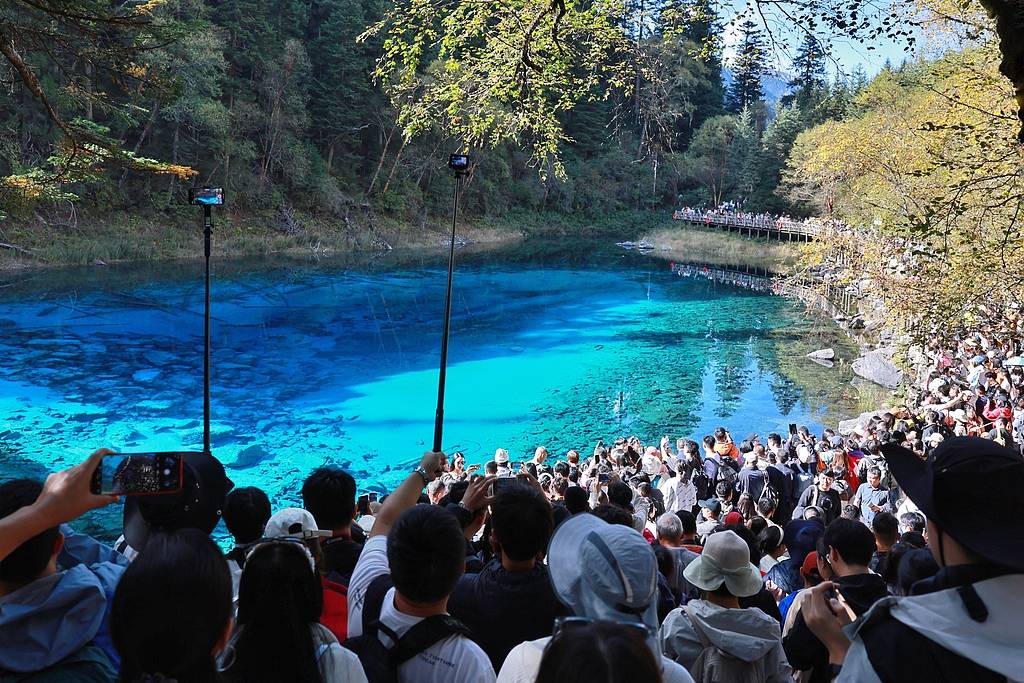 2025年10月2日,四川阿坝州,各地游客在九寨沟观光。