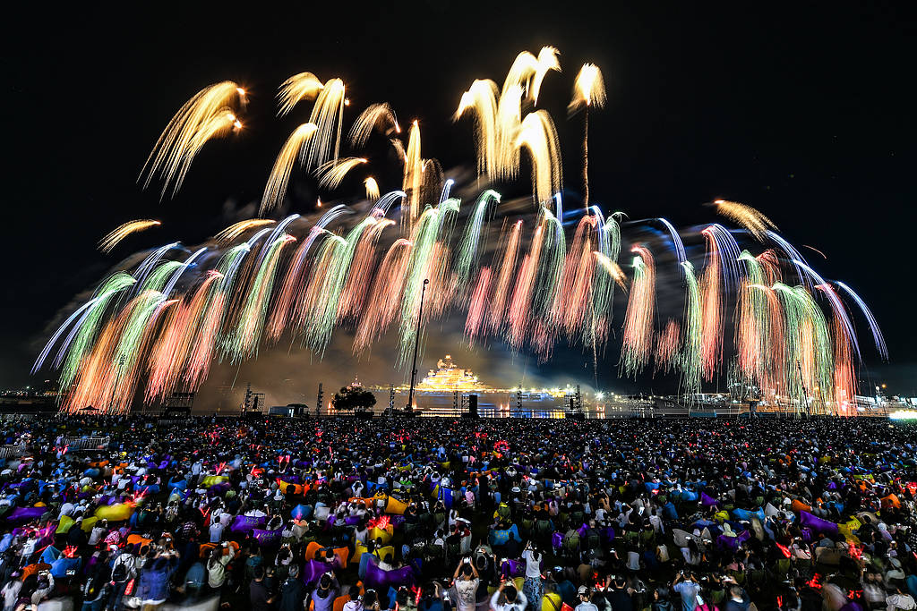 2025年10月2日晚,天津滨海新区,市民和游客在泰达航母主题公园观看无人机焰火秀。