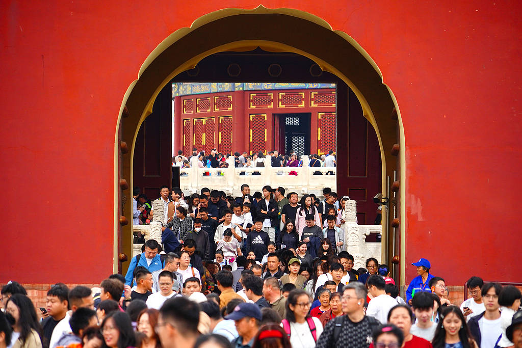 2025年10月3日,北京,天坛公园丹陛桥上人头攒动,众多游客排队进入祈年殿参观游览。当日,北京市属公园共接待游客77.51万人次,游客量排名前三位的是天坛公园、颐和园、北海公园。假期后半段,各公园客流预计仍将保持较高水平。