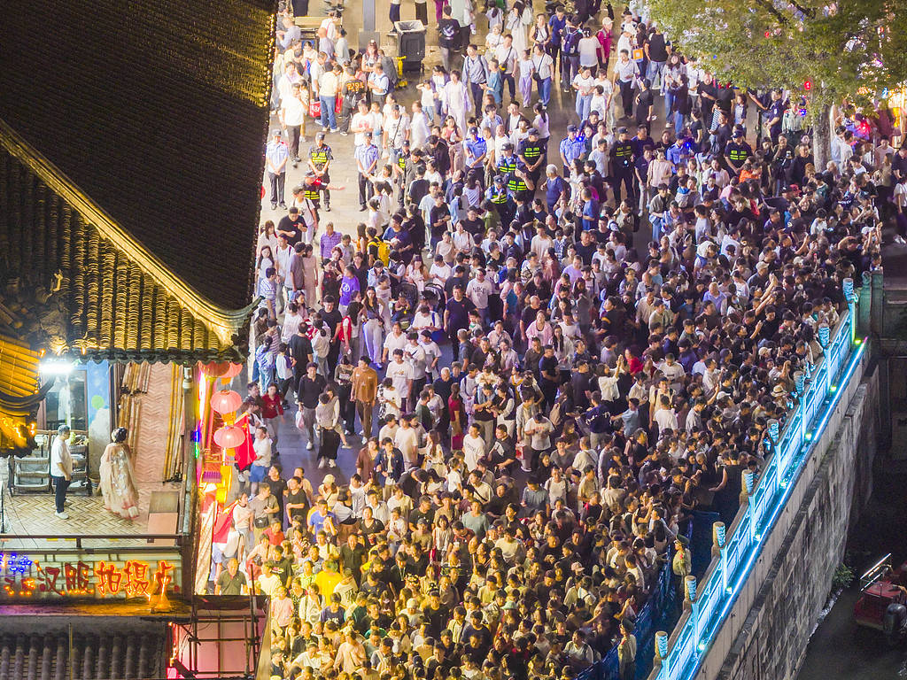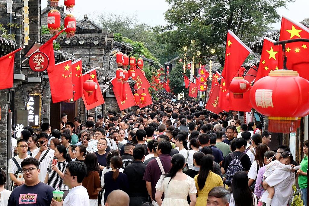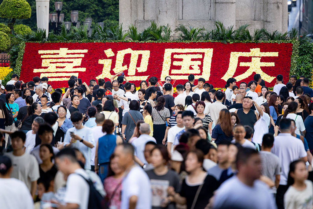 2025年10月1日,重庆,解放碑步行街游客如织,迎来国庆假日游客高峰期。