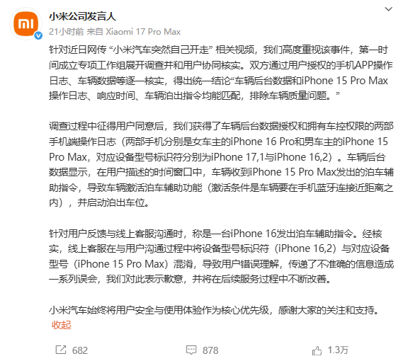 结果没等大伙儿骂够,小米官方啪一下甩出实锤!直接调取车主授权的手机 APP 日志和车辆数据,一查发现:出事那会儿,车主手里的 iPhone 15 Pro Max 明明白白给车发了远程泊车指令,时间、操作记录全对上了,直接排除了车辆质量问题。