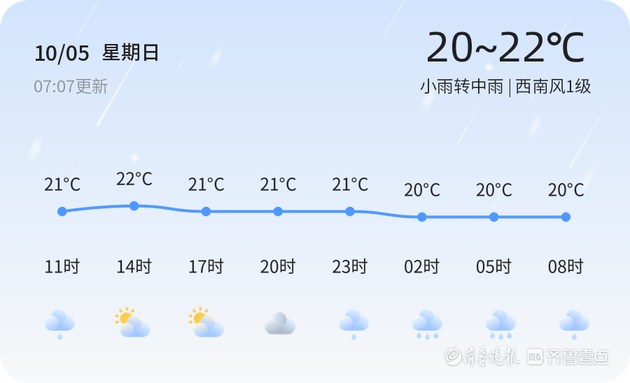 今天是10月5日,农历八月十四。威海市迎来小雨转中雨天气,气温在20℃至22℃之间,西南风1级,空气湿度85%,空气质量为优(PM2.5值23)。今天的降雨可能导致道路湿滑,市民出行时请注意携带雨具,减速慢行,确保行车安全。