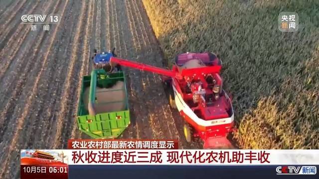 在黑龙江,当地2.2亿亩粮食作物长势整体好于去年,玉米、水稻、大豆成熟期同比提前了3—5天。北大荒投入一批新研制的大马力、大喂入量的收割机,加快了机收进度。
