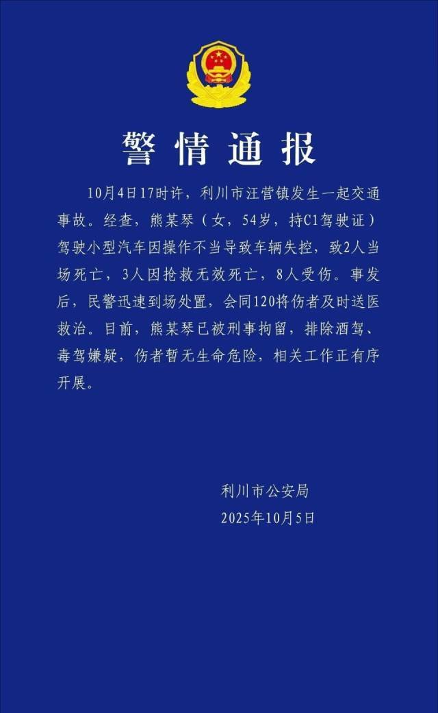 湖北警方通报:驾车致5死8伤,熊某琴被刑拘